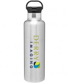 24 oz powder coated double wall 18/8 stainless steel thermal bottle with copper vacuum insulation, threaded gear-shaped insulated lid and carrying handle Complies with FDA, Prop 65. 11.25" H x 3" W