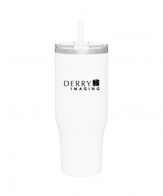 40 oz double wall 18/8 stainless steel thermal tumbler with copper vacuum insulation, stainless steel rim, dual-purpose push-on clear lid, matching sliding closure, flexible wide silicone straw, and powder coated finish